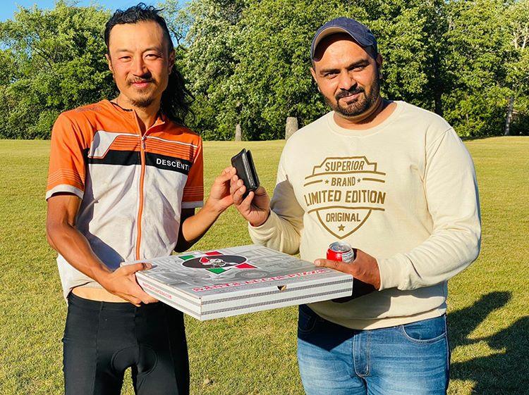 Along the way I found a wallet and keys on the side of the highway. I managed to contact the wallet's owner and returned it to him in Winnipeg. I asked for a medium pizza. He bought me a large pizza and, after listening to my story, gifted me an extra $70 cash! I also mailed the keys to the car dealership identified on the set.