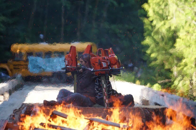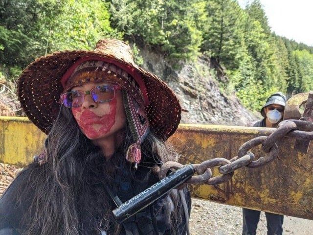 May 2021 - protesters began locking themselves to the road, or up in trees in creative ways, learning from practices carried out during anti-logging protests in Clayaquot in the 80's. The sleeping dragon, for example, is a system where a hole is chiseled out in the middle of the forest road, a heavy duty chain would be put in the hole and concrete poured in to lock the chain in, then people would be handcuffed to the chain. Royal Canadian Mounted Police (RCMP) began raiding these blockades and forcibly removing and subsequently arresting protesters
